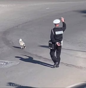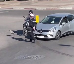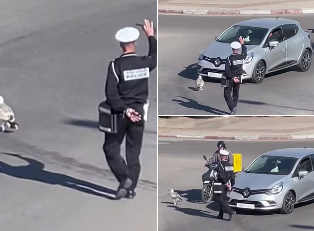 قام شرطي مرور فمدينة الجديدة يسهر على السير بتقاطع مروري بإعطاء إشارة باليد لسيارة خفيفة من نوع “رونو كليو” كانت قادمة من احد الشوارع بالتمهل والتوقف لفسح المجال لطائر النورس الذي كان بصدد عبور التقاطع المذكور.