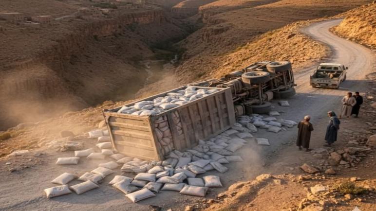 وقعت صباح اليوم الأربعاء 12 نونبر الجاري بالطريق الإقليمية رقم 7106 الرابطة بين جماعتي أيت هاني بإقليم تنغير وأغبالو نكردوس بإقليم الرشيدية حادثة سير مروعة إثر انقلاب شاحنة مقطورة (رومورك) كانت محملة بأكياس الإسمنت على مستوى جماعة أيت هاني.