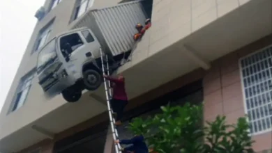 شاحنة تقتحم مبنى في الصين وتتدلى من الطابق الثاني