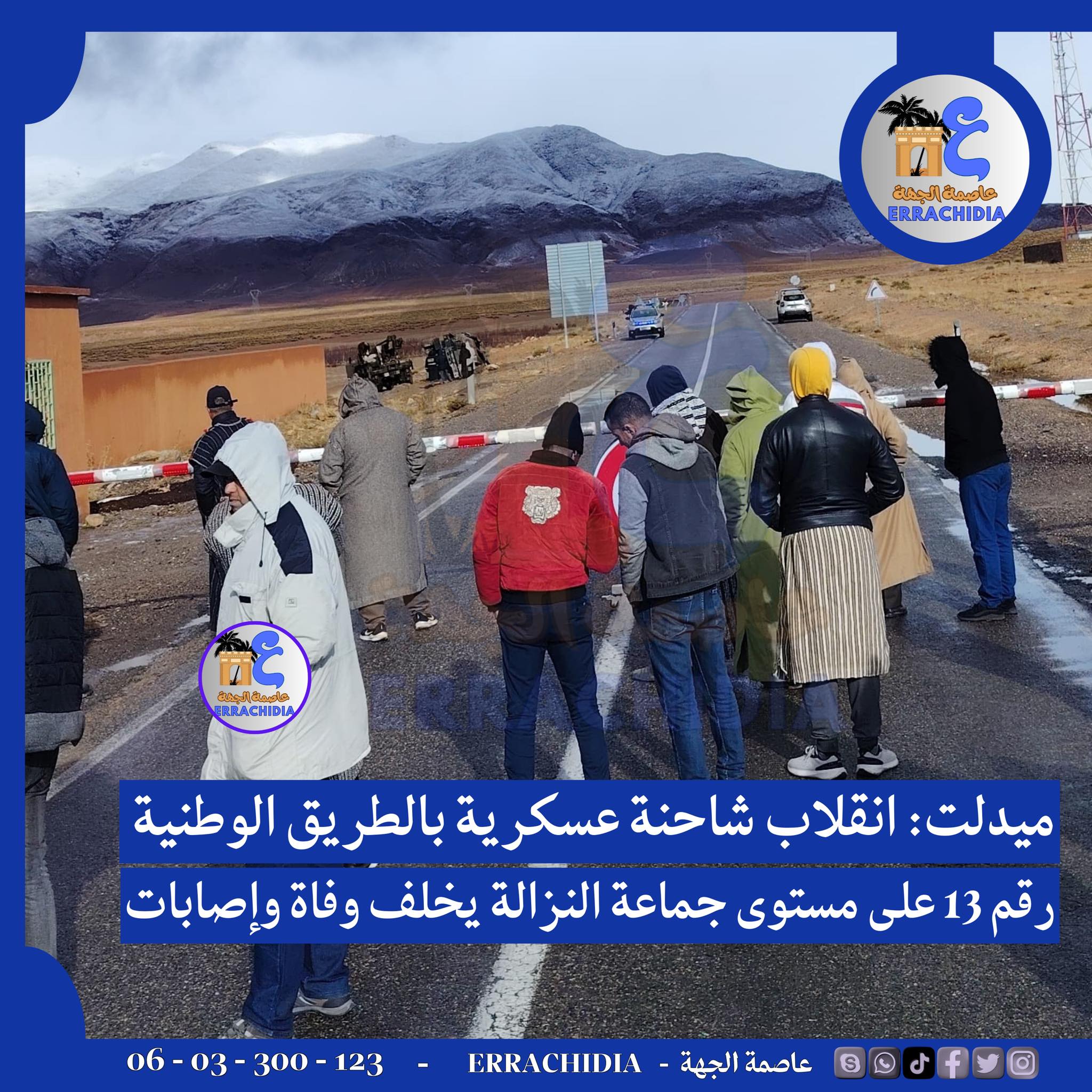 ميدلت: انقلاب شاحنة عسكرية بالطريق الوطنية رقم 13 على مستوى جماعة النزالة يخلف وفاة وإصابات