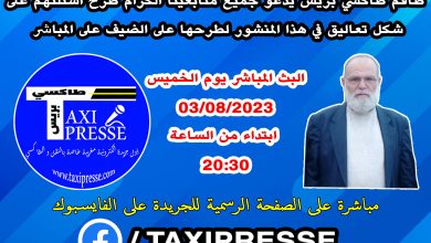 ترقبوا حلقة استثنائية جديدة يوم الخميس 03 غشت 2023 ابتداء من الساعة 20:30 مساء مباشرة على طاكسي بريس تيفي مع السيد احمد صابر الكاتب الوطني UGTM TAXI