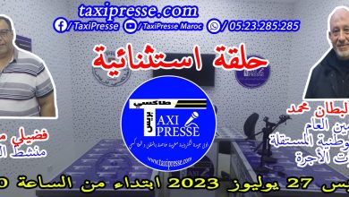 ترقبوا حلقة استثنائية جديدة يوم الخميس 27 يوليوز 2023 ابتداء من الساعة 20:30 مساء مباشرة على طاكسي بريس تيفي مع السيد الحاج محمد البطان الأمين العام للفدرالية الوطنية المستقلة لسيارات الأجرة