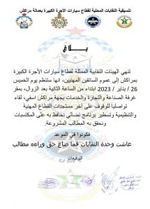 الرئيسية/آخر المستجدات/تنسيقية النقابات المحلية للطاكسيات الكبيرة بمراكش تقرر تنظيم لقاء تواصليا يوم 26 يناير للوقوف على مستجدات القطاع المهنية تنسيقية النقابات المحلية للطاكسيات الكبيرة بمراكش تقرر تنظيم لقاء تواصليا يوم 26 يناير للوقوف على مستجدات القطاع المهنية طاكسي بريسيناير 24, 20230 326 أقل من دقيقة شاركها فيسبوك تويتر ماسنجر ماسنجر واتساب مشاركة عبر البريد طباعة طاكسي بريسيناير 24, 20230 326 أقل من دقيقة شاركها فيسبوك تويتر ماسنجر ماسنجر واتساب مشاركة عبر البريد طباعة