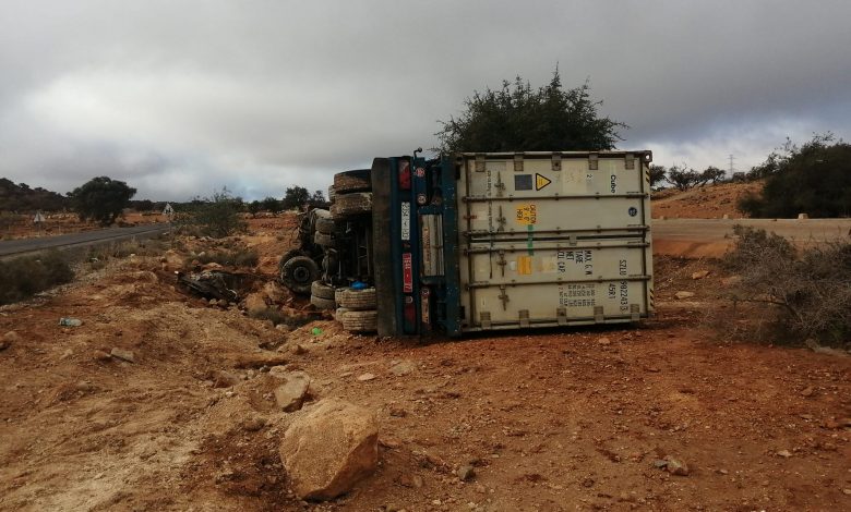 نجاة سائق شاحنة بعد انقلابها بمفترق الطرق بالاخصاص