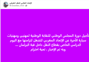 الرئيسية/آخر المستجدات/تأجيل دورة المجلس الوطني لنقابة UMT TAXI لهذا السبب تأجيل دورة المجلس الوطني لنقابة UMT TAXI لهذا السبب طاكسي بريسنوفمبر 20, 20240 426 أقل من دقيقة شاركها فيسبوك تويتر ماسنجر ماسنجر واتساب مشاركة عبر البريد طباعة طاكسي بريسنوفمبر 20, 20240 426 أقل من دقيقة شاركها فيسبوك تويتر ماسنجر ماسنجر واتساب مشاركة عبر البريد طباعة