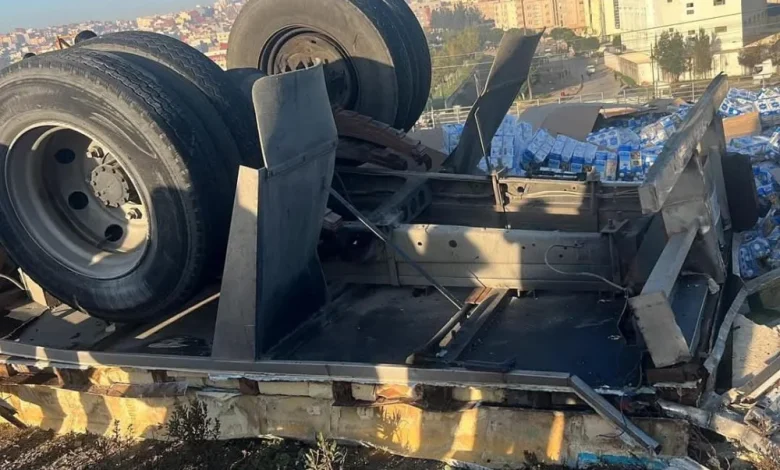 ووفقا لشهود عيان، وقع الحادث نتيجة فقدان السائق السيطرة على المركبة عند منحدر حاد، ما تسبب في انقلاب الشاحنة على جانب الطريق، ما خلف أضرارا جسيمة بالشاحنة، فيما غطت عبوات الحليب الطريق، ما أحدث اضطرابات في حركة السير.