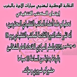 الرئيسية/آخر المستجدات/نقابة UGTM TAXI تقرر اجتماع مكتبها التنفيذي الدوري يوم 08 دحنبر 2024 بالرباط نقابة UGTM TAXI تقرر اجتماع مكتبها التنفيذي الدوري يوم 08 دحنبر 2024 بالرباط طاكسي بريسديسمبر 2, 20240 287 أقل من دقيقة شاركها فيسبوك تويتر ماسنجر ماسنجر واتساب مشاركة عبر البريد طباعة طاكسي بريسديسمبر 2, 20240 287 أقل من دقيقة شاركها فيسبوك تويتر ماسنجر ماسنجر واتساب مشاركة عبر البريد طباعة