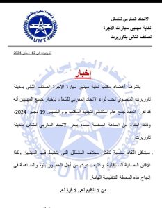 الرئيسية/آخر المستجدات/نقابة UMT TAXI للصنف الثاني بتاوريرت تقرر عقد عام إستثنائي يوم 19 دجنبر الجاري لتجديد مكتبها نقابة UMT TAXI للصنف الثاني بتاوريرت تقرر عقد عام إستثنائي يوم 19 دجنبر الجاري لتجديد مكتبها طاكسي بريسديسمبر 17, 20240 252 أقل من دقيقة شاركها فيسبوك تويتر ماسنجر ماسنجر واتساب مشاركة عبر البريد طباعة طاكسي بريسديسمبر 17, 20240 252 أقل من دقيقة شاركها فيسبوك تويتر ماسنجر ماسنجر واتساب مشاركة عبر البريد طباعة