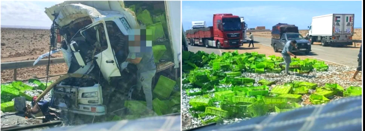 لقي سائق شاحنة نقل سمك مصرعه اثر اصطدام قوي من الخلف بشاحنة من الحجم الكبير قرب السد القضائي للدرك الملكي "واد الواعر" بالطريق السريع كلميم-العيون.