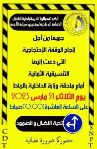 وجهت النقابة الوطنية لمهنيي سيارة الاجرة المنضوية تحت لواء الكونفدرالية الديمقراطية للشغل نداء تحت عنوان جميعا من اجل انجاح الوقفة الاحتجاجية التي دعت اليها الثنسيقية الثمانية امام ملحقة وزارة الداخلية بالرباط يوم الثلاثاء 21 مارس 2021 على الساعة العاشرة صباحا