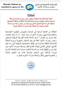 وجهت الامانة العامة للفدرالية الوطنية لمستغلي رخص سيارات الاجرة نداء الى جميع الفروع الجهوية والمحلية التابعة للفدرالية الوطنية لمستغلي رخص سيارات الأجرة – Fnelt من أجل الحضور للوقفة الاحتجاجية الوطنية التي دعا اليها التنسيق الثماني الثماني يوم الثلاثاء 21 مارس 2023 ابتداء من الساعة العاشرة صباحا امام الملحقة الادارية لوزارة الداخلية بحي الرياض بالرباط .