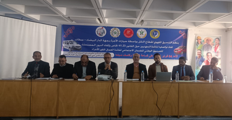 نظم التنسيق الجهوي لقطاع النقل بواسطة سيارات الأجرة بجهة الدار البيضاء – سطات المكون من النقابات الآتية: UGTM TAXI و CDT TAXI و UNTM TAXI و FDT TAXI و ODTL TAXI يوم الأحد 4 فبراير 2024 لقاء تواصليا بمقر الكونفدرالية الديمقراطية للشغل بالدار البيضاء مع ممثلي الصندوق الوطني للضمان الإجتماعي لفائدة المهنيين العاملين بقطاع النقل بواسطة سيارات الاجرة بجهة الدار البيضاء – سطات حول قانون 41.23 الخاص بالغاء الديون المستحقة لهدا الصندوق لفائدة العمال الغير الاجراء ومنهم مهنيي سيارات الأجرة .