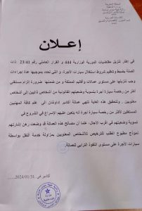 اصدرت عمالة اكادير ادوتنان اعلانا تنهي فيه الى علم كافة المهنيين المستغلين لاكثر من رخصة سيارة اجرة الى الاسراع في الشروع في تسوية وضعيتهم في اقرب الاجال اعمالا لمقتضيات الدورية الوزارية 444 و للقرار العاملي 23.41 ذات الصلة بضبط و تنظيم شروط استغلال سيارات الاجرة هذه الاجراءات الجديدة المتضمنة في الدورية الوزارية 444 و التي وجب تنزيلها على مستوى عمالات و اقاليم المملكة حسب الاعلان و من ضمنها ضرورة الزام مستغلي اكثر من رخصة سيارة اجرة بتسوية وضعيتهم القانونية من شخاص ذاتيين الى شخاص معنويين .