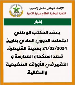 يعقد المكتب الوطني للنقابة الوطنية لقطاع سيارة الاجرة اجتماعه الدوري العادي يوم 21 فبراير 2024 بمدينة القنيطرة وفق جدول اعمال محدد في استكمال المدارسة و التقرير في الاوراق التنظيمية و النضالية .