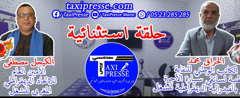 هذا وسينشط فعاليات هذه الحلقة المباشرة مع ضيفي طاكسي السيد محمد الحراق الكاتب الوطني للنقابة الوطنية لسائقي سيارات الأجرة العضو في الفدرالية الديمقراطية للشغل والسيد مصطفى الكيحل الأمين العام للاتحاد الديمقراطي للشغل بالمغرب كل من /