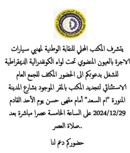 قررت المكتب المحلي للنقابة الوطنية لمهنيي سيارات الاجرة المنضوين تحت لواء الكونفدرالية الديمقراطية للشغل بالعيون عقد جمع عام استثنائي لتجديد المكتب يوم الاحد 29 دجنبر 2024 على الساعة الخامسة مساءا .