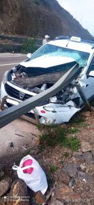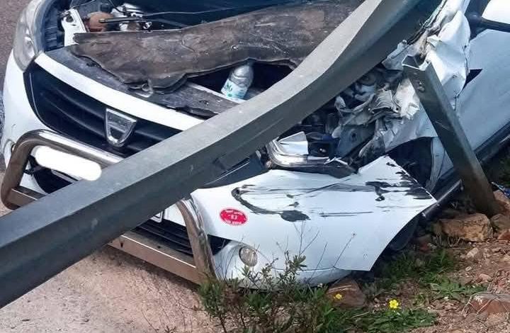 ارتطام طاكسي كبيرة بحاجز وقائي يتسبب في خسائر مادية فادحة بالمركبة بهذه الطريق