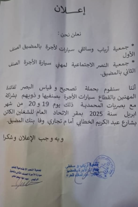 تعلن كل من جمعية أرباب وسائقي سيارات الأجرة الصنف الأول بالمضيق و جمعية النصر الاجتماعية لمهني سيارة الأجرة الصنف الثاني بالمضيق عن تنظيم حملة لتصحيح وقياس البصر لفائدة المهنيين بقطاع سيارات الأجرة بصنفيها، وكذلك ذويهم، وذلك بشراكة مع بصريات المحمدية.