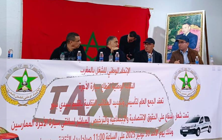 في إطار التوسع التنظيمي للنقابة الوطنية لقطاع سيارة الأجرة المنضوية تحت لواء الإتحاد الوطني للشغل بالمغرب تم عقد جمعا عاما يوم الأحد 30 نونبر 2025 بمدينة سيدي بنور حيث تم تجديد المكتب المحلي لسيارة الأجرة الصغيرة وتأسيس المكتب المحلي لسيارة الأجرة الكبيرة وكذلك تأسيس المكتب الإقليمي لسيارة الأجرة بصنفيها بسيدي بنور.