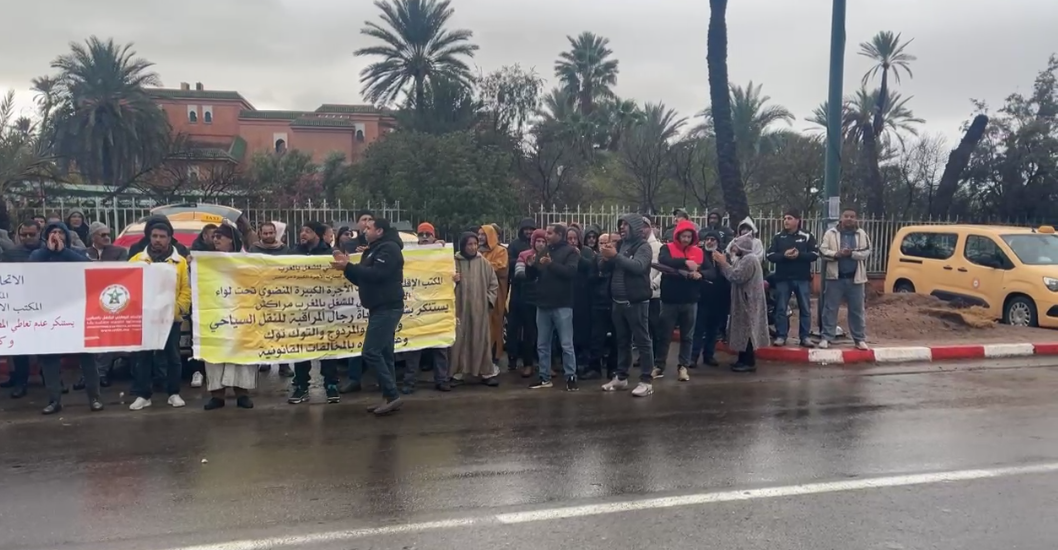 نظم مهنيو سيارات الاجرة الكبيرة بمراكش وقفة احتجاجية رفعوا فيها شعارات مطالبة بتمكينهم من حقوقهم مستنكرين الاختلالات بالمنطقة السياحية النخيل و محاباة المراقبة للنفل السياحيو السري و المزدوج و توك توك و عدم جبره بالمخالفات القانونية .