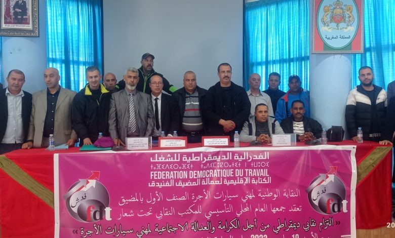 تحت شعار : ” إلتزام نقابي ديمقراطي من أجل الكرامة والعدالة الإجتماعية لمهني سيارات الأجرة ” عقدت النقابة الوطنية لمهني سيارات الأجرة الصنف الأول بالمضيق العضو بالفدرالية الديمقراطية للشغل و تحت اشراف كل من الإتحاد المحلي والمكتب الوطني جمعها العام المحلي التأسيسي للمكتب النقابي و قد افضى الجمع العام الى انتخاب السيد عبد السلام الحراق كاتبا عاما للنقابة الوطنية لمهني سيارات الأجرة العضو بالفدرالية الديمقراطية للشغل الصنف الأول بالمضيق.