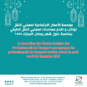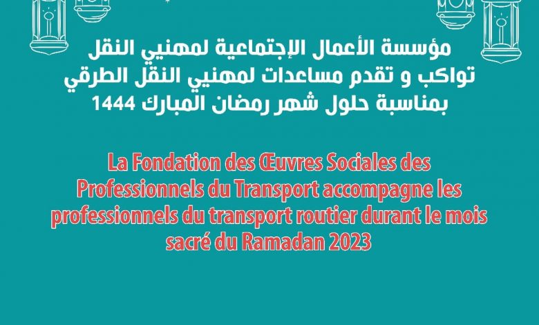 تعنزم مؤسسة الأعمال الإجتماعية لمهنيي النقل FOSPT إبتداء من يوم الأحد المقبل 4 رمضان 1444 الموافق ل 26 مارس 2023 اطلاق عملية مواكبة و تقديم إعانات لفائدة مهنيي و شغيلة النقل الطرقي، بمناسبة حلول شهر رمضان 1444 وذلك حسب الإمكانيات المتوفرة لديها .